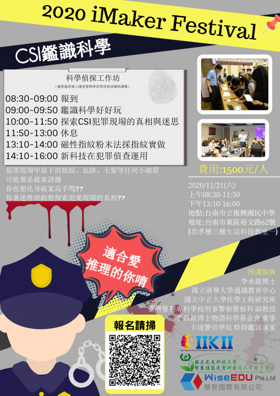 一、本科學營介紹跨人文科技領域的鑑識科學和犯罪現場,從 好玩的鑑識科學歷程,血跡噴濺分析原理,血腥的犯罪現 場照片,教導學生了解犯罪調查的科學程序,最後探索社 會大眾關注的冤獄問題,引導帶入數位新科技的 3D 掃描、 3D 列印、虛擬實境(VR) 和擴增實境(AR),配合 3D 動畫和虛 擬實境的 3D 影像合成,運用在犯罪現場調查、重建與培訓 教育的領域,找出破案關鍵,一起來見證鑑識科學的未 來。