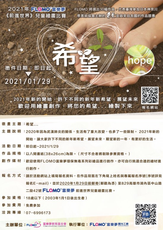 一、為讓臺灣孩子藉由畫作走出國門,前進世界,也讓世界感 受臺灣孩子豐沛的創作能量, FLOMO 富樂夢自 2016 年起與日本神 奈川縣美術家協會主辦的《県展》合作,將臺灣徵選的優秀作 品送至日本展出,並與來自各國的兒童作品競賽。截至 2020 年 已有逾千位小朋友參加甄選,作品頗受日本美術界肯定,數次 奪得日本県展 JUNIOR 賞青少年獎等殊榮。