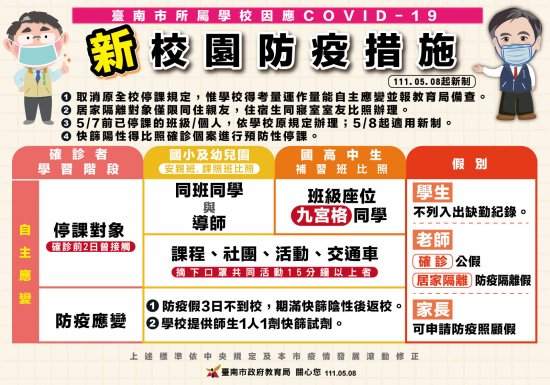 - 檢附「教育部說明校園因應 COVID-19防疫授課方式調整實施原則」(含圖卡)、「校園因應「嚴重特殊傳染性肺炎」(COVID-19)疫情調整防疫措施(高級中等以下學校)110509更新_高中以下調整防疫措施 QA」暨「臺南市新校園防疫措施圖卡(111年 5月 8日)」…等相關公告於本校校網中,提供您參考。
