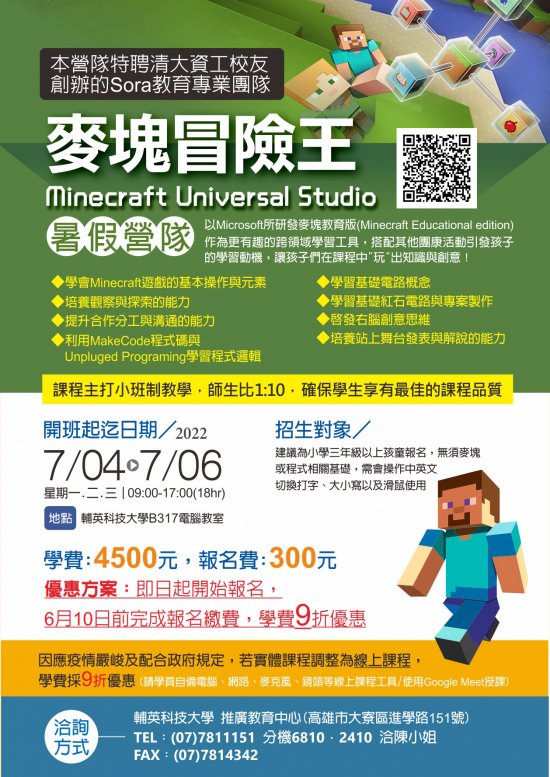 一、課程特色:以麥塊教育版(Minecraft Educational edition)作為學習工具,讓孩子們從玩樂中學習,搭配其他團康活動引發孩子的學習動機,讓孩子們在課程中"玩"出知識與創意!