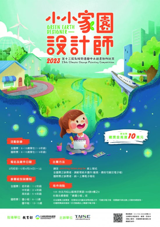 一、由教育部、行政院環境保護署指導,本會主辦之「氣候變遷國中小繪畫創作比賽」迄今已舉辦 12 屆,累計 40 國、 59,152 名學子參與。本屆(第 13 屆)為呼應聯合國永續發展目標(SDGs)的第 11 項,以「小小家園設計師」為主題,提升國中小師生關注天然災害對城市造成的損傷,思考如何降低城市垃圾和空氣污染,同時重視社區文化與自然遺產等。此繪畫比賽也呼應第 13 項,採取氣候行動並提升大眾相關意識。