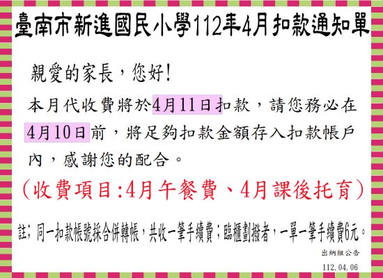 112 年 4 月扣款改於 4 月 11 日,詳如附件。