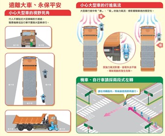 2、遠離大型車且勿與之併行,以防止內輪差及視線死角之交通意外。