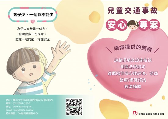 二、為協助兒少及其家庭面對交通事故後之問題及穩定就學,靖娟基金會自 110 年開辦「兒少交通事故安心專案」,以經歷交通事故之兒少為核心,提供法律、醫療、心理、環境檢視與行政倡議之服務。