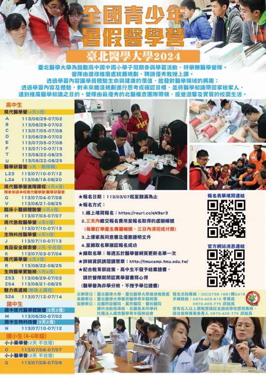二、營隊資訊: 2024 暑期醫學營擬訂於民國 113 年 6 月 29 日至 8 月 25 日辦理。網址 http://tmucamp.tmu.edu.tw/