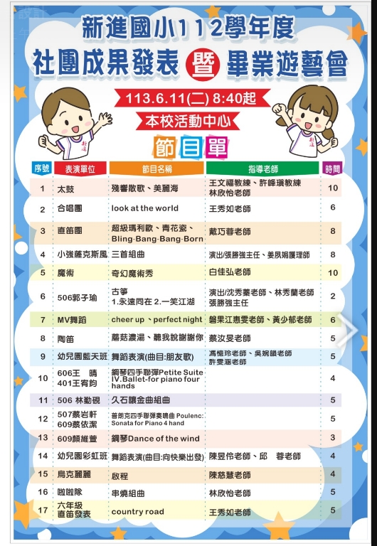 新進國小112學年度「社團成果發表」暨「畢業遊藝會」 節目單
