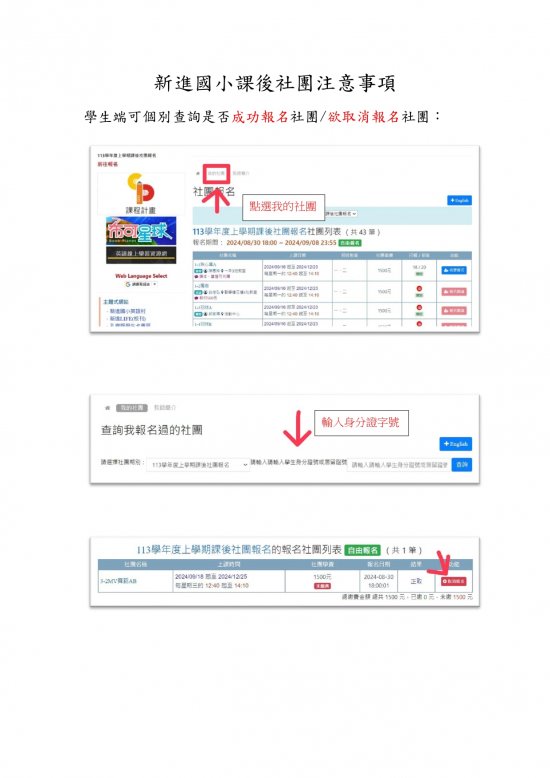 2.如若家長有查詢/取消社團的需求,可請家長們按照圖片中的指示進行操作。