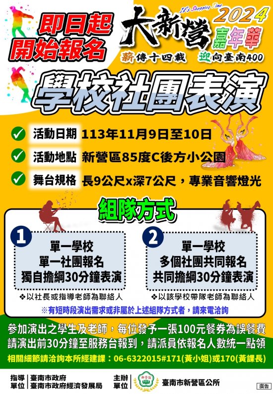 一、本所訂於 113 年 11 月 9 日至 10 日止在本區民權路(民治路至三民路區間)舉辦「2024 大新營嘉年華」,為鼓勵小朋友及年輕學子有機會展現才藝,本活動舞台表演歡迎貴校有意願社團踴躍報名參加,惟場次有限,倘若報名組數超額,本所另依演出內容擇優邀請演出。