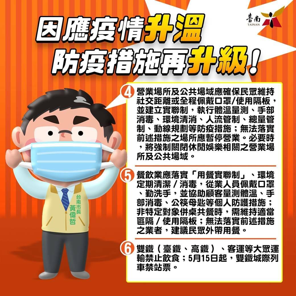 臺南市政府提高防疫規格,宣布疫情舒緩前,從 5/13 日(四)至 6/14(一)校園禁對外開放、落實師生勤洗手、戴口罩、量體溫、入校量測體溫。