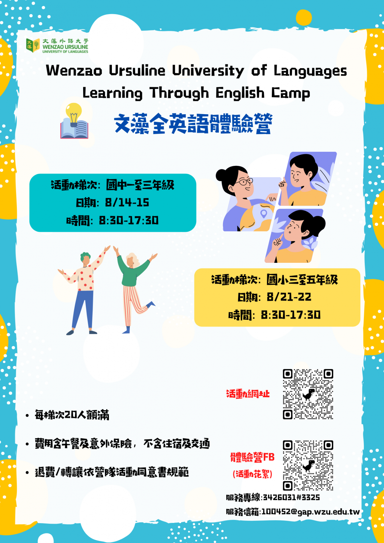 說明: 一、培養學生沉浸於全英語學習環境,輕鬆開口說英語並體驗異國文化等。 二、本活動為全英語授課,活動結束後本校將製發研習證書(國中梯次)。 三、相關報名資訊請參閱附件 1~3 。 四、詳請可連結本校推廣部網頁 https ://c049.wzu.edu.tw/查詢、文藻全英語教學認證粉絲專頁 https ://http://www.facebook.com/WenzaoTTE/ 或洽專線 07-3426031 分機 3325 。
