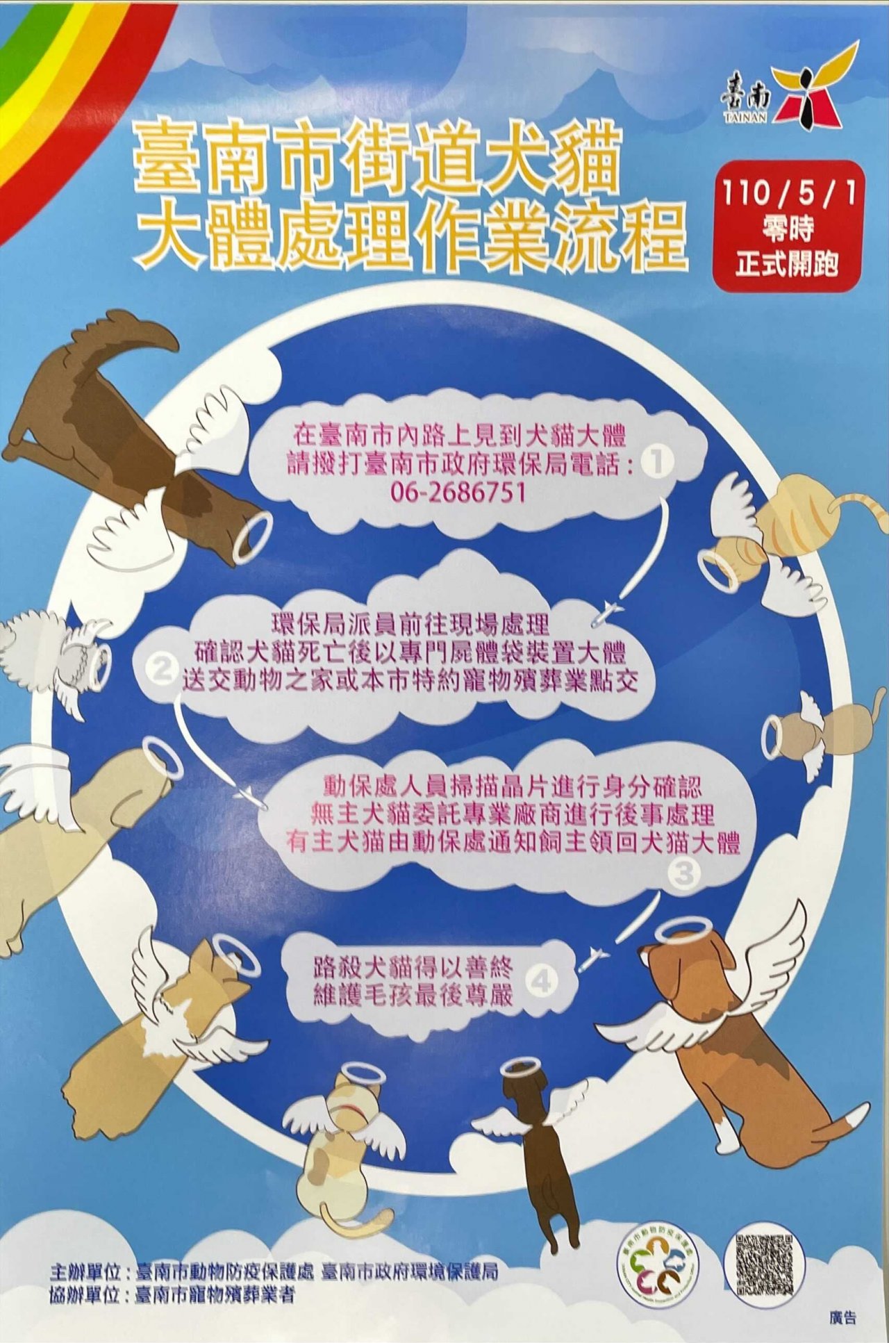 在台南市內路上見到犬貓大體,請撥打台南市政府環保局電話: 06-2686751 ,其餘請詳閱附件