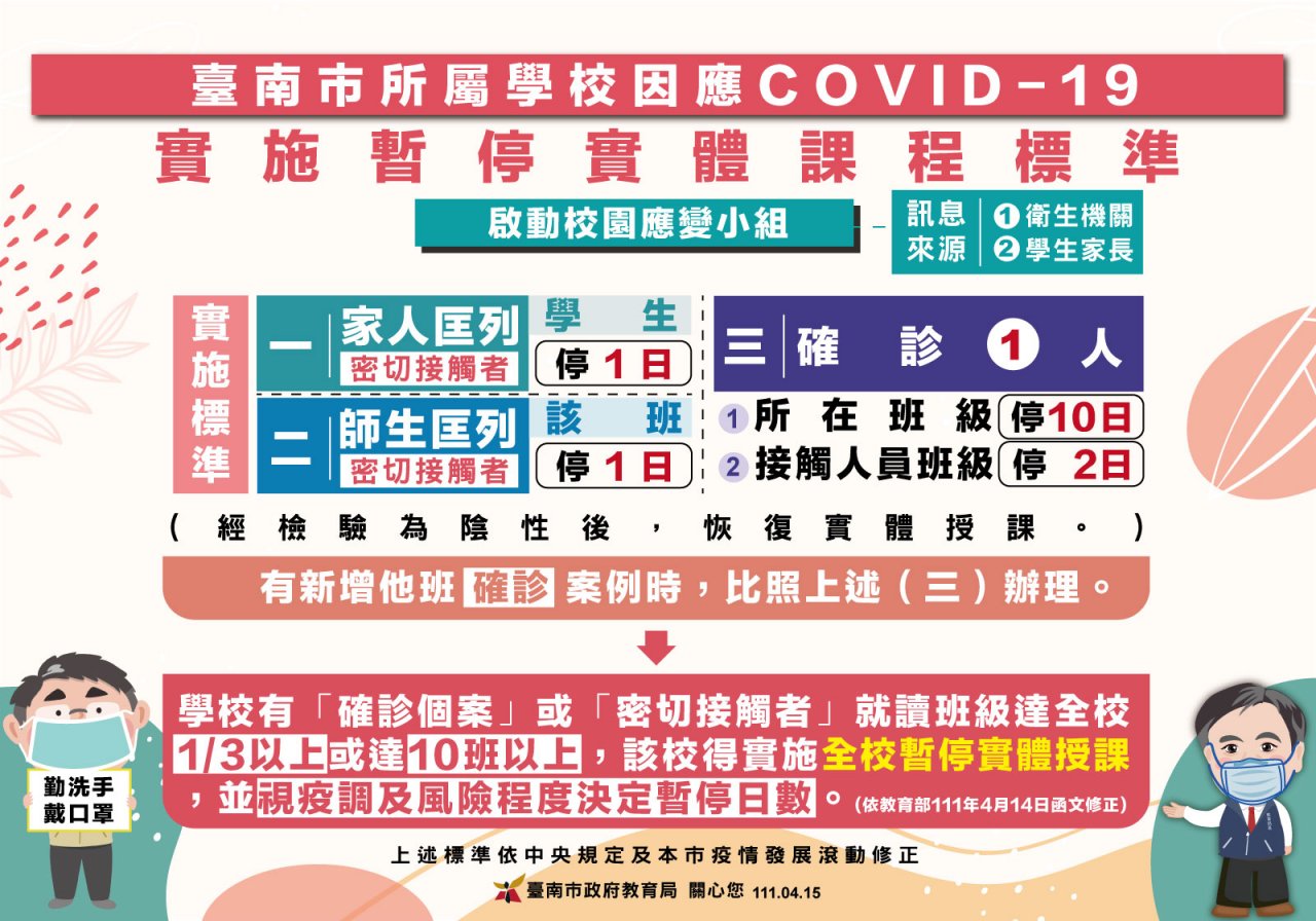 四、檢附教育局111415日「臺南市所屬學校因應COVID-19實施暫停實體課程標準」圖卡供參(如附件)