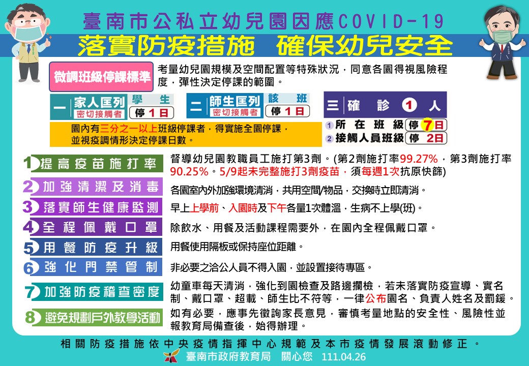 因應疫情發展,中央流行疫情指揮中心已公布最新的防疫規範,台南市教育局亦同步修正幼兒園停課標準:(1)幼兒園教職員工生,如有家人被匡列為密切接觸者,該員停止到園1日;(2)若有師生被匡列為密切接觸者,該班停課1日;(3)如有確診者1人,該班停課7日,且確診者接觸人員之班級,停課2日;(4)園內有3分之一以上班級停課者,得實施全園停課,並視疫調情形決定停課日數。
