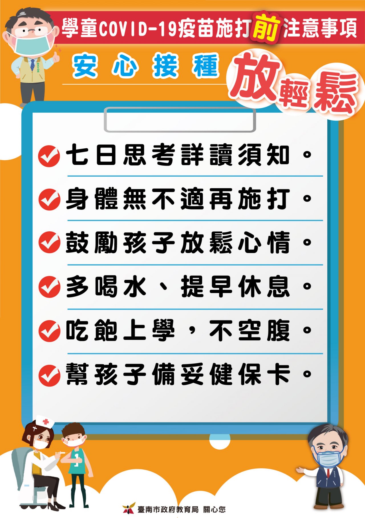 為協助學生與家長了解接種疫苗前、後注意事項,宣導圖卡及提醒相關注意事項如附件供參考。