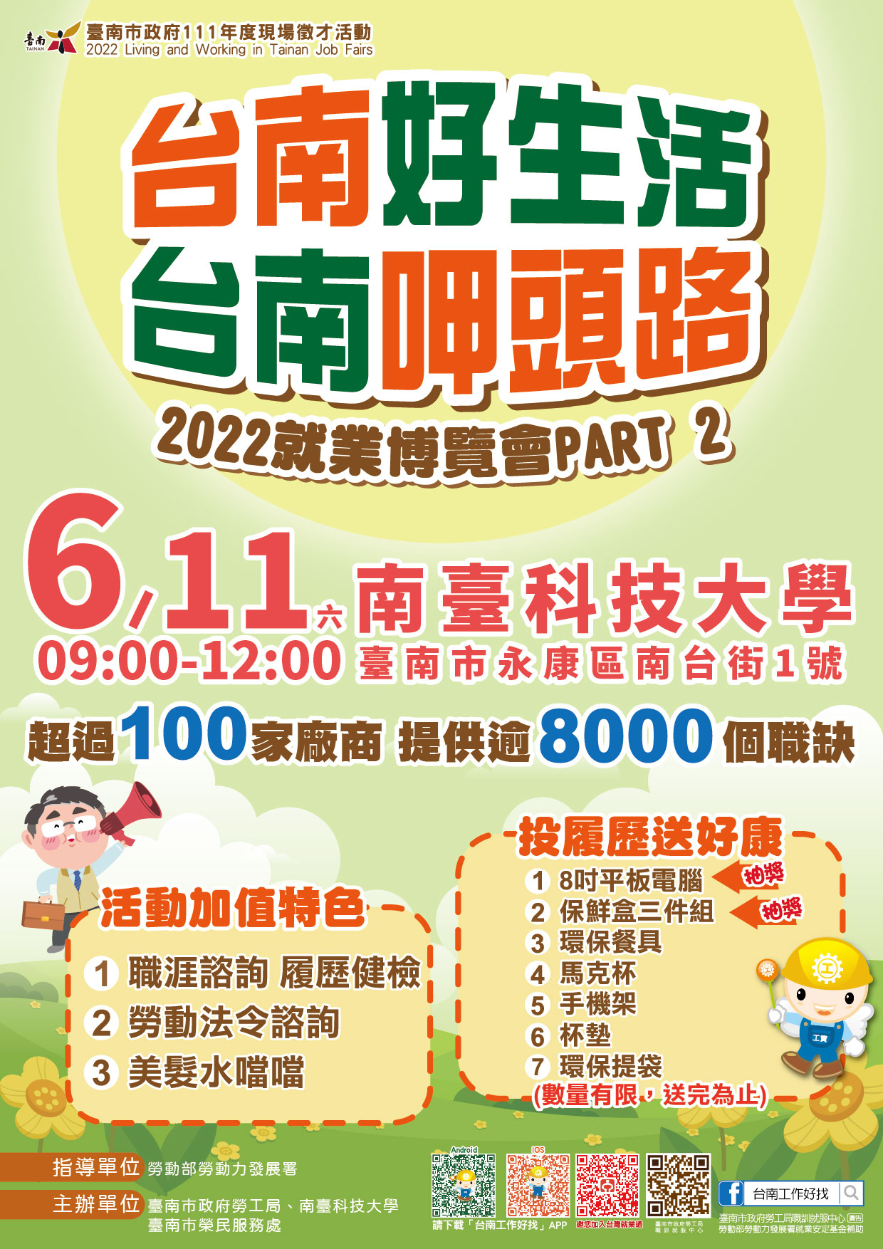 二、 2022「台南好生活 台南呷頭路」Part2 就業博覽會,將在 6 月 11 日(週六)上午 9 時於永康區南臺科技大學辦理,當日超過 100 家廠商,提供逾 8000 個工作機會;活動當天有「職涯諮詢 履歷健檢」、「勞動法令諮詢」、「美髮水噹噹」等免費服務,並可抽平板電腦,詳洽: 06-6330820 。