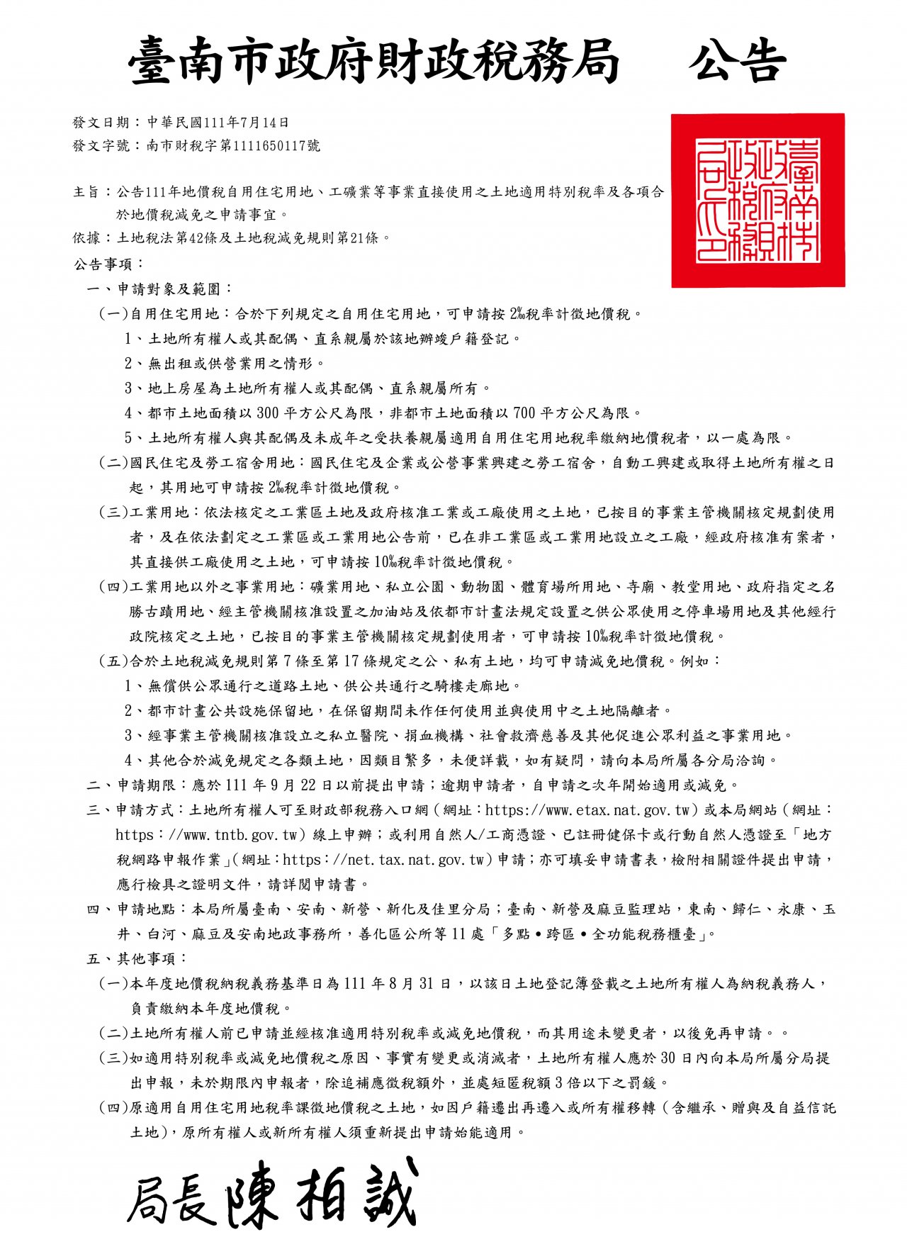 說明: 一、依據土地稅法第 42 條及土地稅減免規則第 21 條規定辦理。 二、為維護納稅義務人權益,亦請協助以 LED 電子看板、字幕機 或電視牆等管道,廣為播放「111 年地價稅適用特別稅率及 各項減免稅地申請期限至 111 年 9 月 22 日截止」