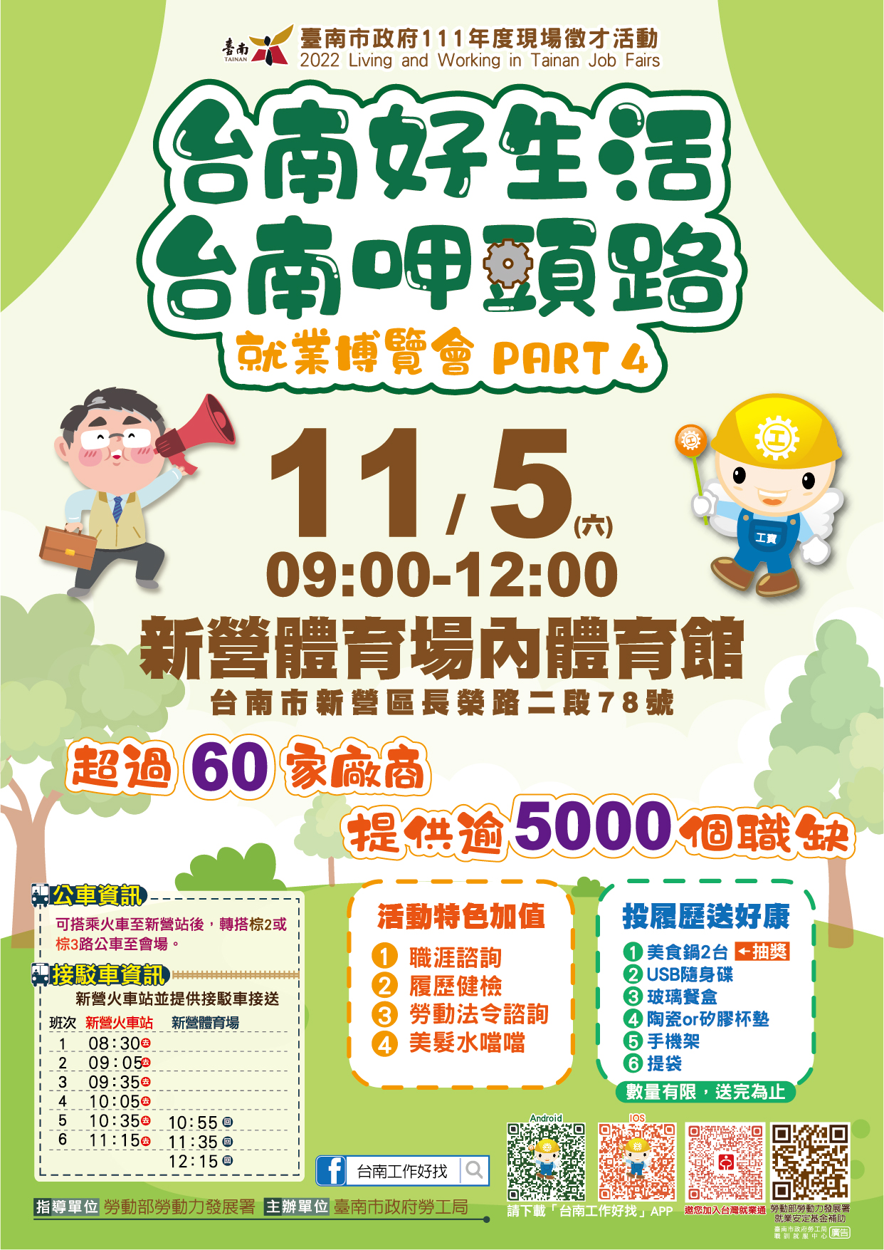 二、 2022「台南好生活 台南呷頭路」Part4 就業博覽會,將在 11 月 5 日(週六)上午 9 時於新營體育場內體育館辦理,當日超過 60 家廠商,提供逾 5000 個工作機會;活動當天有「職涯諮詢 履歷健檢」、「勞動法令諮詢」、「美髮水噹噹」等免費服務,並可抽美食鍋,