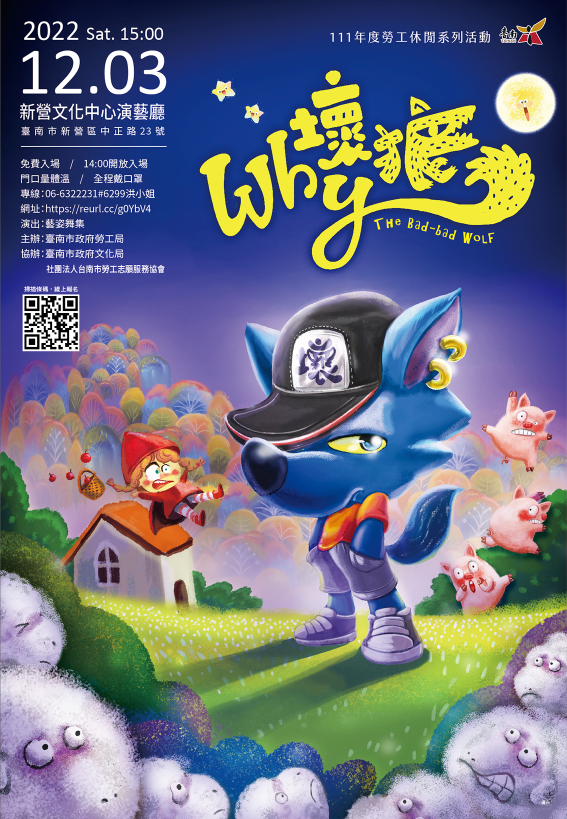 一、旨揭活動訂於 111 年 12 月 3 日(星期六)下午 3 點於新營文化中心(地址:臺南市新營區中正路 23 號)辦理,邀請致力推廣於國內文化藝術與國際文化傳揚交流之「藝姿舞集」演出-兒童舞劇「WHY 壞狼」,以嘉惠本市勞工朋友及眷屬。