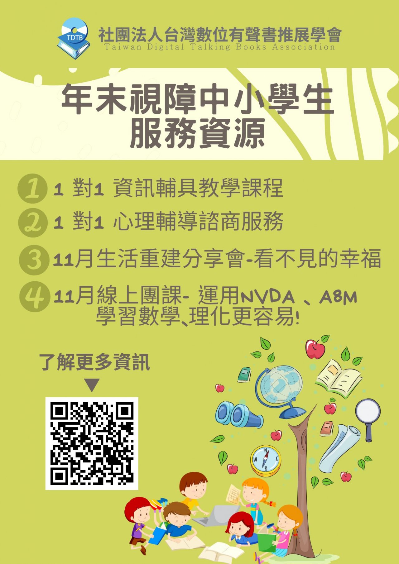 三、 11 月以及 12 月份年末服務資源及活動涵蓋 1 對 1 資訊輔具教學、 1 對 1 心理輔導諮商服務、 11 月生活重建分享會及 11 月數理線上團課等,詳細內容及報名方式請見附件。