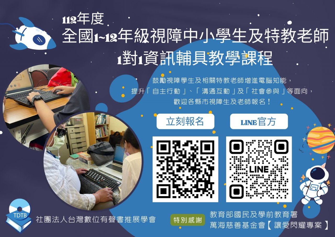 2. 社團法人台灣數位有聲書推展學會辦理全國 1~12 年級視障中小學生及特教老師 1 對 1 資訊教育輔具教學課程,針對全國就讀於 1~12 年級領有身心障礙手冊之視障學生、其家長及特教或巡迴老師,提供一對一實體或遠距電腦教學。