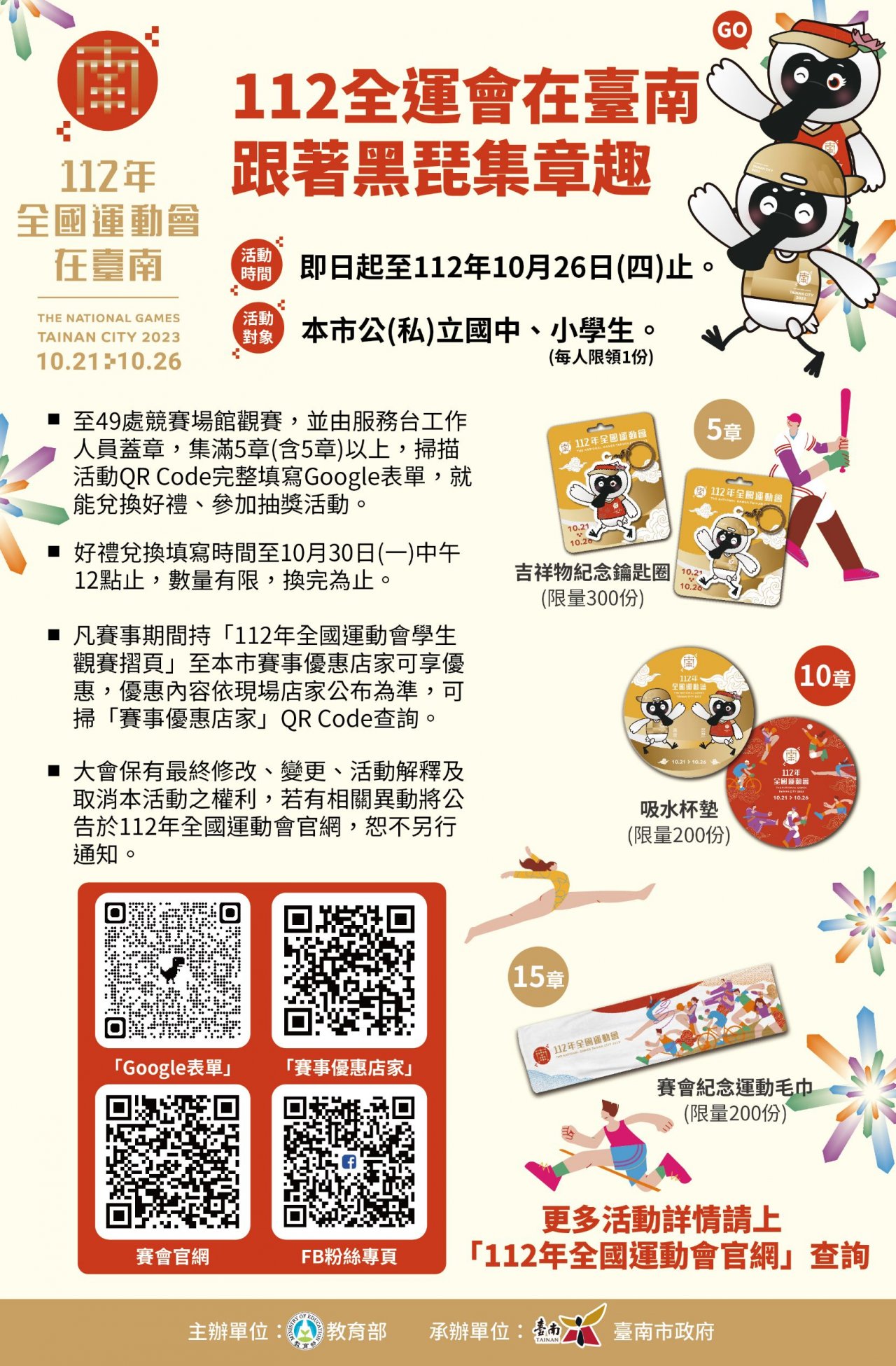 集滿 5 章:可兌換「吉祥物紀念鑰匙圈」1 份 (限量 300 份) 集滿 10 章:可兌換「吸水杯墊」1 份 (限量 200 份) 集滿 15 章:可兌換「賽會紀念運動毛巾」1 份 (限量 200 份) (每人限換 1 項,且不累積兌換)