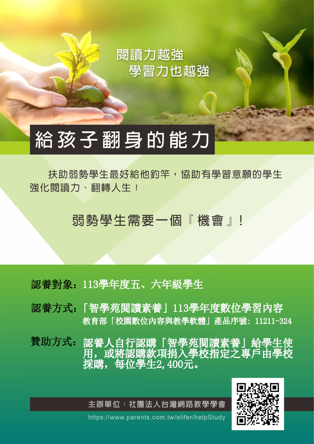 二、即日起敬請貴校老師協助學生提報 113 學年度五、六年級經濟弱勢且有學習意願的弱勢學生,自 113 年 8 月 1 日起就能免費使用「智學苑閱讀素養」,弱勢學生的認定委由學校教師全權認定,請給這些學生一個自我學習的機會。