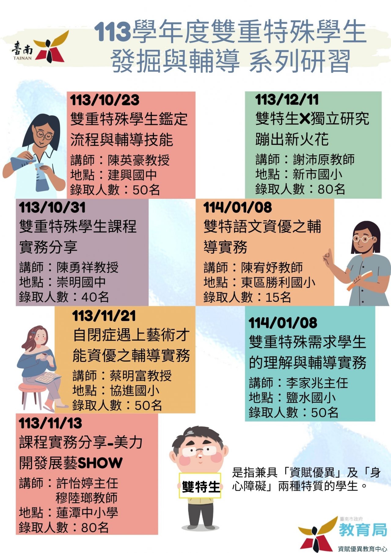 一、依據:教育部國民及學前教育署 113 學年度補助臺南市政府辦理雙重特殊需求學生發掘與輔導方案實施計畫。