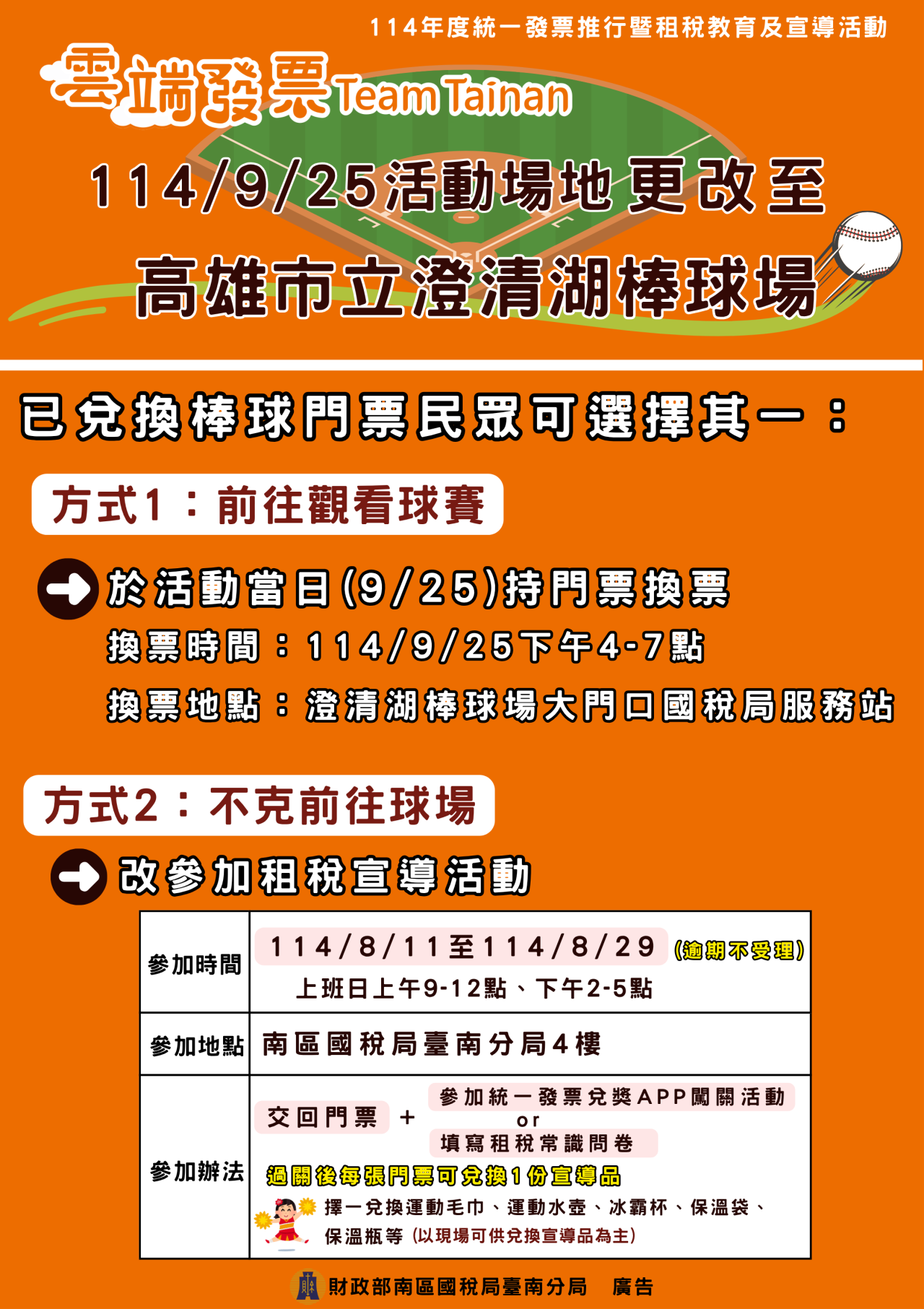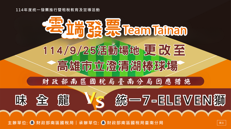 主旨:本分局原定 114 年 9 月 25 日「雲端發票 Team Tainan」於臺南巿立棒球場舉辦之租稅宣導活動,為配合棒球賽事調整比賽場地,該場租稅宣導活動更改至高雄巿立澄清湖棒球場辦理,請協助於貴單位網站、 APP 分享 eDM 宣導周知,請查照。