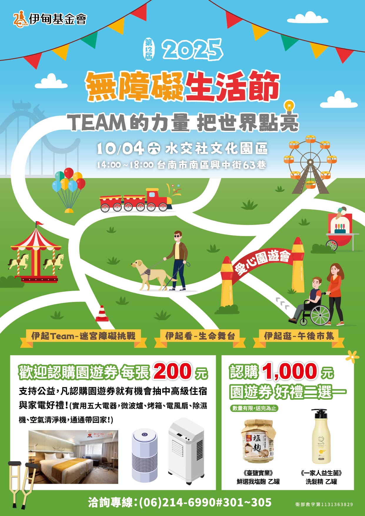 今年 10 月 4 日(星期六),伊甸基金會將舉辦一年一度的 「無障礙生活節」,本活動已在台南連續舉辦第 12 年,伊甸基金會希望透過此活動,拉近社會大眾和身心障礙朋友的距離。