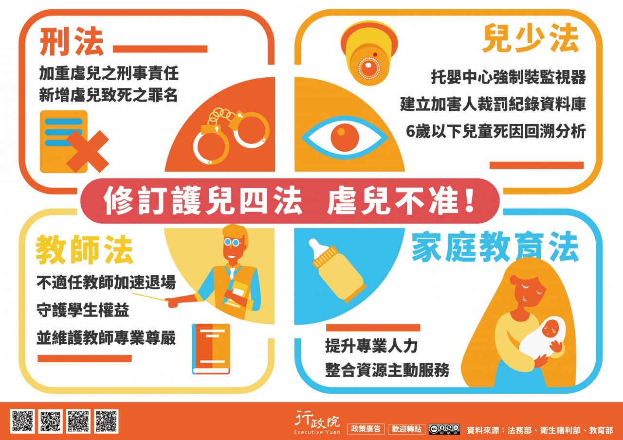 二、為加強宣導政府修正「刑法」、「兒少法」、「教師法」、「家庭教育法」等4法部分條文,以完善兒少保護網絡,特製作旨揭電子單張文宣(eDM),請協助推廣運用,電子檔請逕至行政院全球資訊網「政策與計畫─政策櫥窗」項下下載。