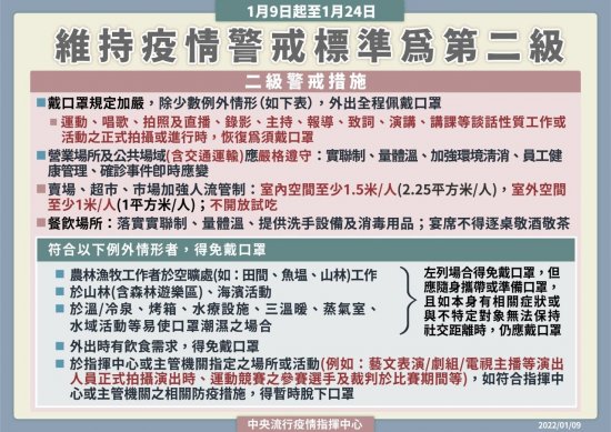 二、疫情警戒標準第 2 級期間,嚴重特殊傳染性肺炎中央流行疫情指揮中心(以下簡稱指揮中心)調整或維持相關措施及規定如下: