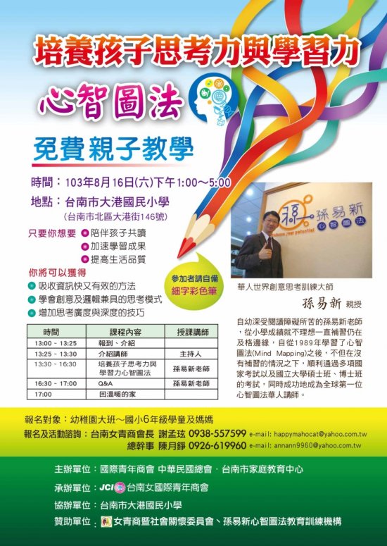 (一)活動時間: 103 年 8 月 16 日(六),下午 1:00 至 5:00 。 (二)活動地點:臺南市北區大港國民小學(臺南市北區大港 街 146 號)。 (三)本活動報名及諮詢,請洽台南女國際青年商會總幹事陳月 錚, 0926-619960 。