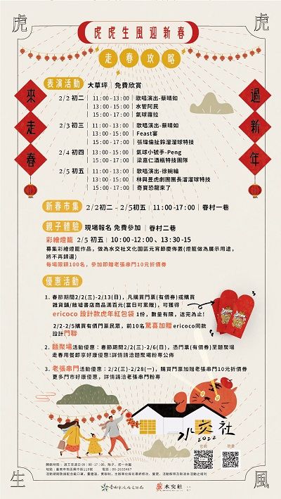 說明: 一、水交社文化園區前身為空軍眷村,透過舉辦 2022 年春節活動「虎虎生風迎新春」,持續與民眾良好互動,提供民眾新春休閒及欣賞藝文的活動空間。 二、旨揭活動自 111 年 2 月 2 日至 2 月 5 日,上午 9 時至下午 5 時,系列活動包含互動雜耍、精彩特技、魔術表演街藝表演、親子彩繪燈籠、新春市集陪大小朋友一起走春過新年,體驗新春熱鬧氣氛。