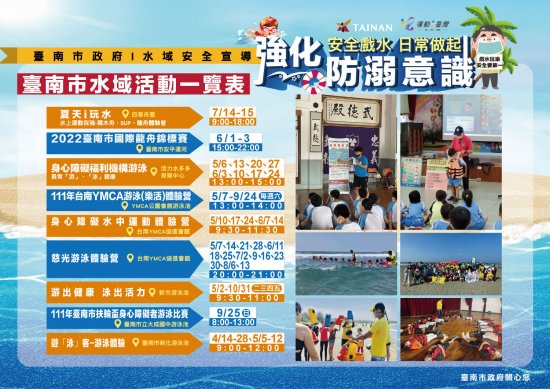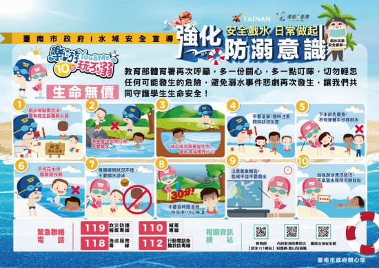 - 檢附本市 111 年水域宣導圖卡供參,請各校下載使用,各校可至本市水域安全網(http://watersafety.tn.edu.tw)與教育部體育署學生水域運動安全網(https://watersafety.sa.gov.tw/)下載宣導短片與海報檔案等資源使用。