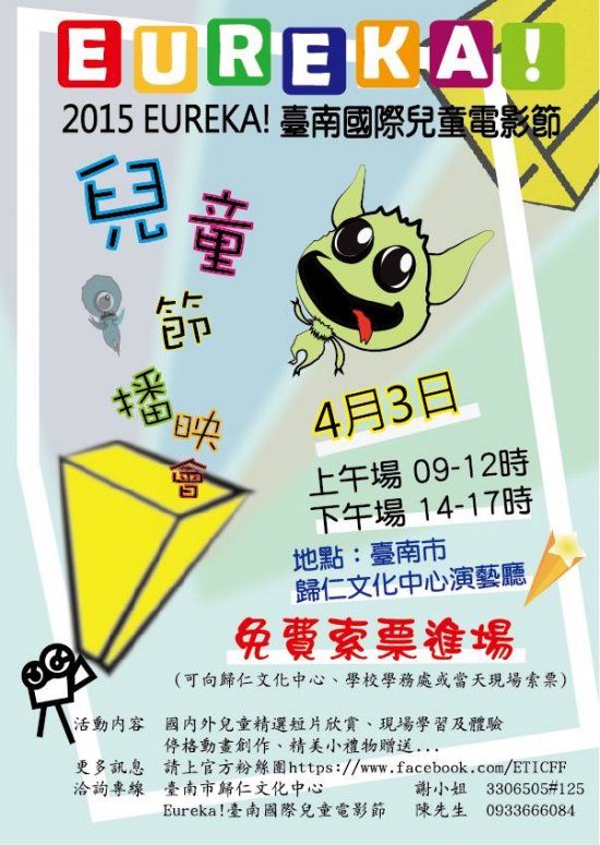 一、社團法人臺南市教師會為推動兒童影像教育,推廣兒童動畫,特與臺南市教育產業工會及歸仁文化中心合作,於104 年 4 月 3 日(星期五)假臺南市歸仁文化中心演藝廳辦理「Eureka!臺南國際兒童電影節兒童節播映會」。 二、當日活動共分上、下午兩場,有精選短片欣賞、現場學習與體驗、停格動畫創作等,本次活動傳單訊息如附件,採免費索票入場,索票洽詢專線:臺南市歸仁文化中心謝小姐 06-3306505 轉 125 或 Eureka!臺南國際兒童電影節 陳先生 0933666084 。