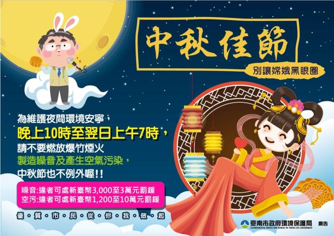 去年中秋連假,臺南市共開出 11 張違反管制時段燃放爆竹煙火罰單。今年中秋與國慶連假同週,市民歡聚慶祝之際,臺南市政府環保局提醒大家務必遵守噪音防制與環境整潔規定,連假期間稽查不打烊,市府出動餘 50 人次針對南區黃金海岸、安平林默娘公園、觀夕平台及四草大橋等熱門地點擴大宣導與加強取締,共同營造安寧、乾淨、低碳的節慶環境。