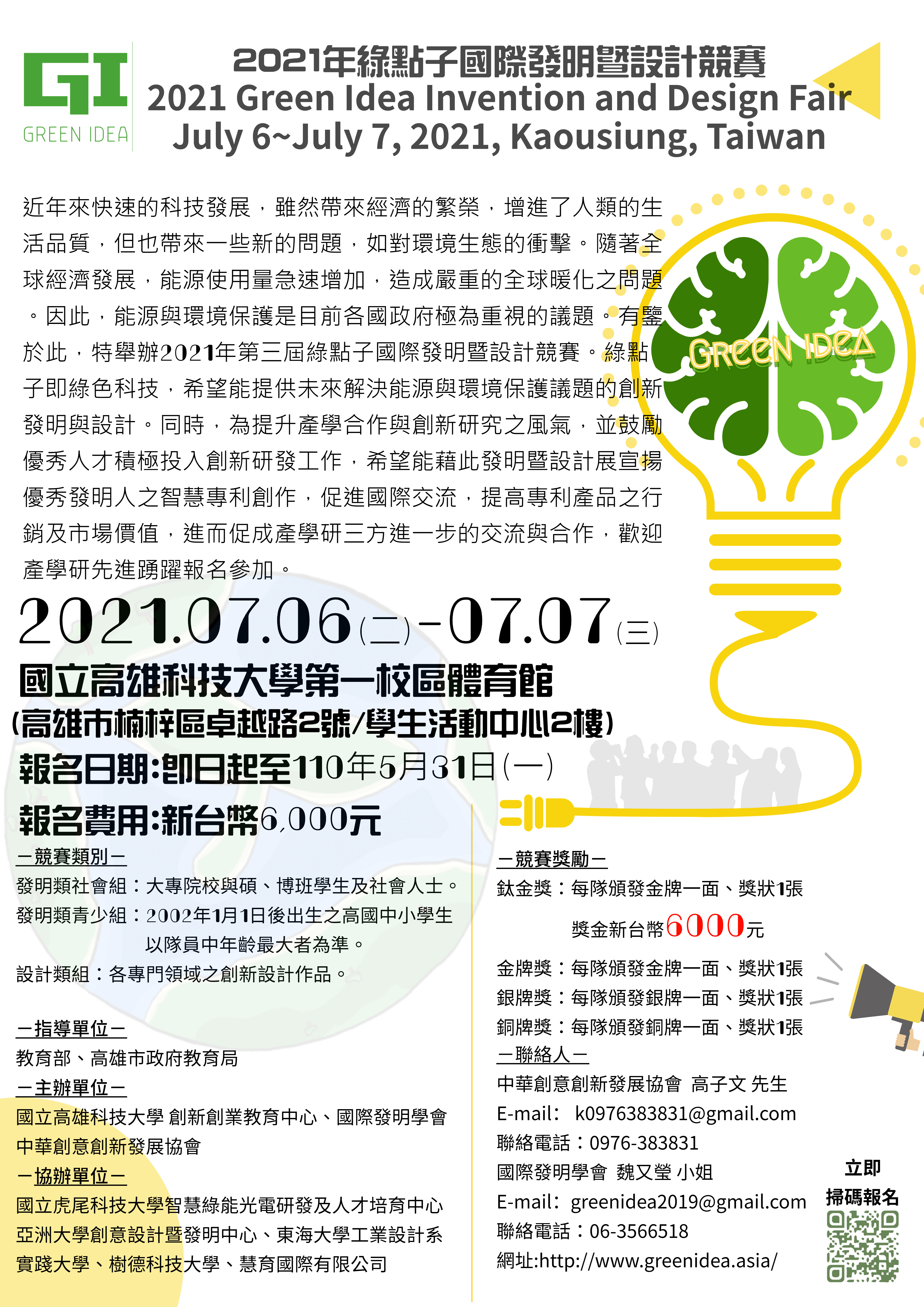 三、競賽報名截止時間為 110 年 5 月 31 日(一),詳細訊息請參閱競賽海報及 2021 年第三屆綠點子國際發明暨設計競賽官網,網址: http://www.greenidea.asia/。