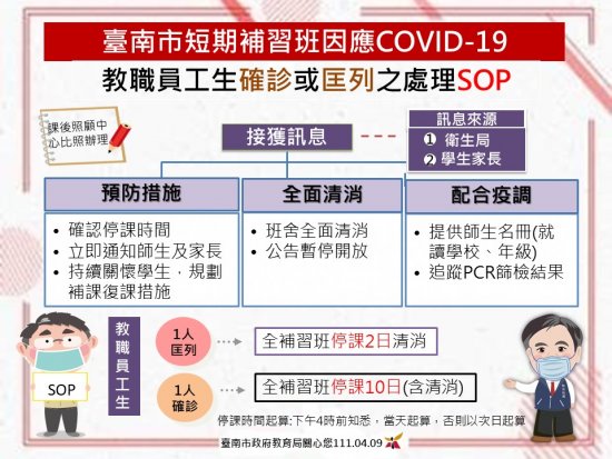 各位家長好,今天臺南市政府公告永康區大橋國中附近的一家美語補習班已有學生確診新冠肺炎,目前衛生局已經發送相關的訊息給該補習班上課的同學。如果有貴子弟於該補習班上課、或已經收到衛生局、補習班的通知,為了孩子的健康,請盡快私下與班級導師聯繫,謝謝各位家長的協助。