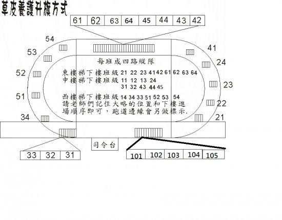 請各班導師協助指導明天升旗各班的行進路線與操場位置