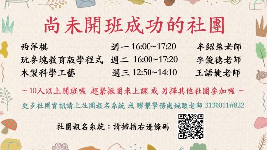更多社團資訊請上社團報名系統,或聯繫學務處婉頤老師 3130011#822