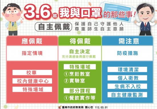 因應 3/6 調整校園防疫規定,以下重點整理,並請參考圖卡: