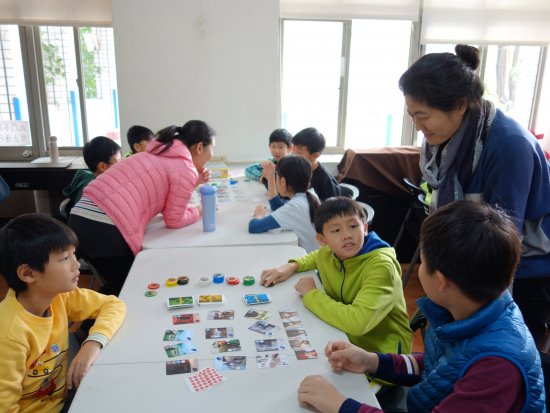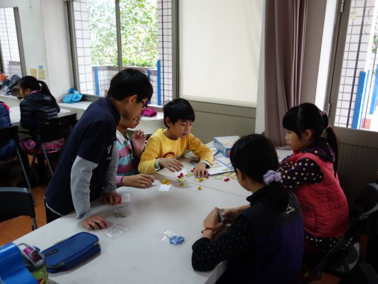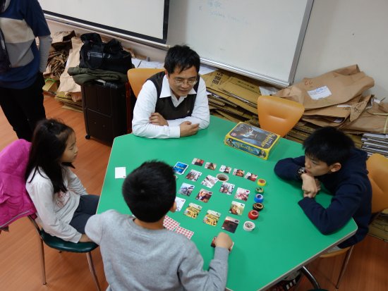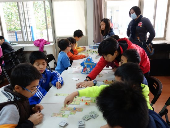 利用學期末的最後一天, 504 、 507 及 509 三個班級,在桌遊達人許奶爸的帶領下,進行了一場人數高達 80 人以上的桌遊活動。除了三個班級的導師─朱慧美老師、王惠蓉老師及蘇文昭老師外,還動員了三個班級的志工家長群。學生們一桌桌的坐定,每一組各有不同的桌遊進行著,瞬間多功能教室變得好熱鬧啊!