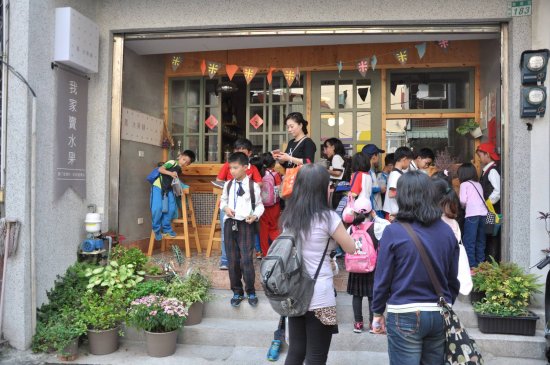 我們來到一家特別的艾爾摩莎書店,門口有許多關於臺南的舊地圖,老闆和老闆娘很和善的讓小孩們分兩批進入觀察,我請小孩們仔細觀察這家店和一般的書店有什麼不一樣?