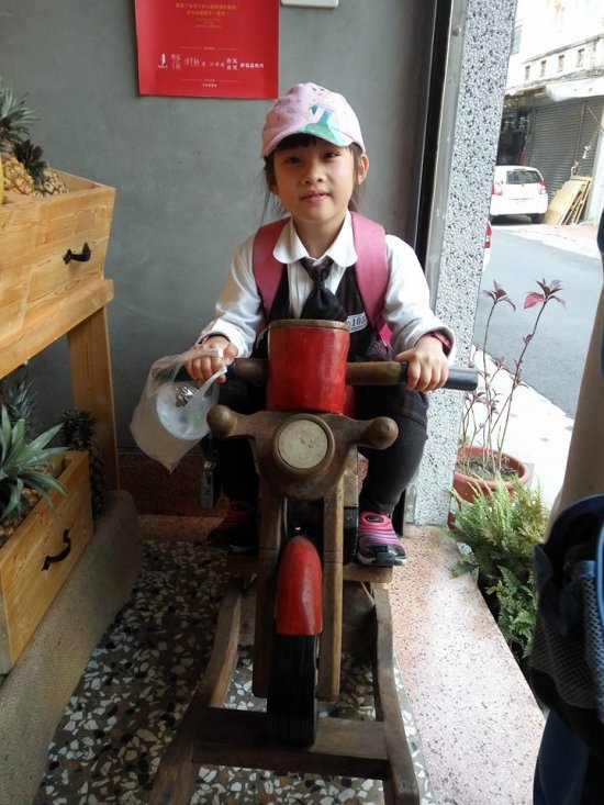 孩子騎著老闆娘特別允許的小木馬,開心的騎,也問著:門口的水果佈置箱是真的嗎?