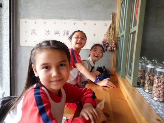 看見了特別的果汁店,叫做鳳冰果舖,年輕的老闆娘打方的讓孩子們在店門口和店裡面觀察,許多孩子望著老闆娘熟練的打著果汁,好想喝和善老闆娘的現打果汁喔!