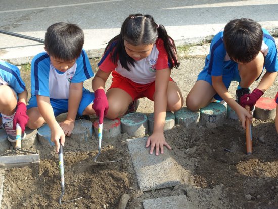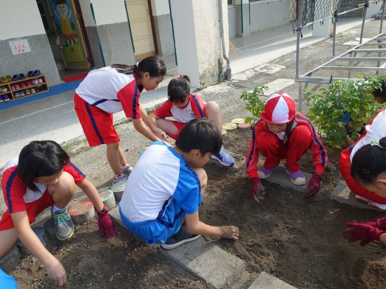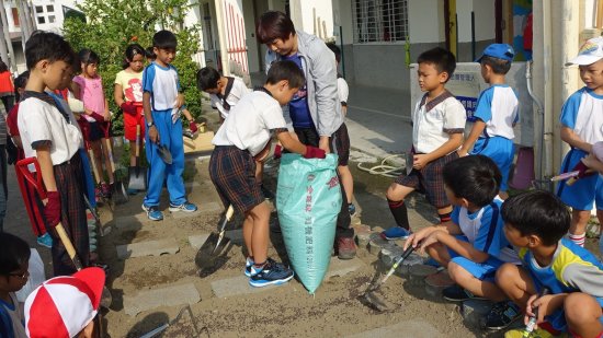 麗屏志工媽媽先示範肥料該如何灑播,以及如何拌入泥土中。一開始,孩子們一點兒都不想用手去碰肥料,認為那是臭臭的雞糞製作的。志工媽媽向孩子介紹我們使用的是植物碎屑發酵製作的有機肥,完全沒有臭味,孩子們這才放心。有的孩子嫌戴手套很熱,脫掉手套,用手觸摸翻拌已經被他們親手翻鬆的泥土。手髒了?沒關係!工作結束後洗乾淨就好了呀!~^^~
