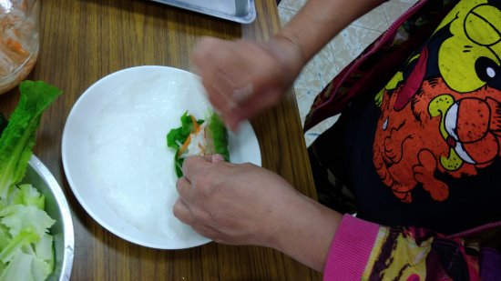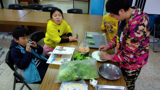 志工媽媽把菜帶回家清洗,清早買芋頭切條包上越南春捲皮油炸,帶來學校之後再用氣炸鍋加熱逼油,配上清脆爽口的小黃瓜和昨晚醃漬的糖醋蘿蔔絲,用越南春捲皮把這些材料包在一起,讓孩子們品嚐。喜歡生菜的孩子才吃第一口,就預約還要再吃一捲啦!不喜歡生菜的孩子,我們也鼓勵他們品嚐看看,自己種的無農藥無化肥,天天聽讀書聲歡笑聲的菜,真的和市場買的不同喔!~^0^~