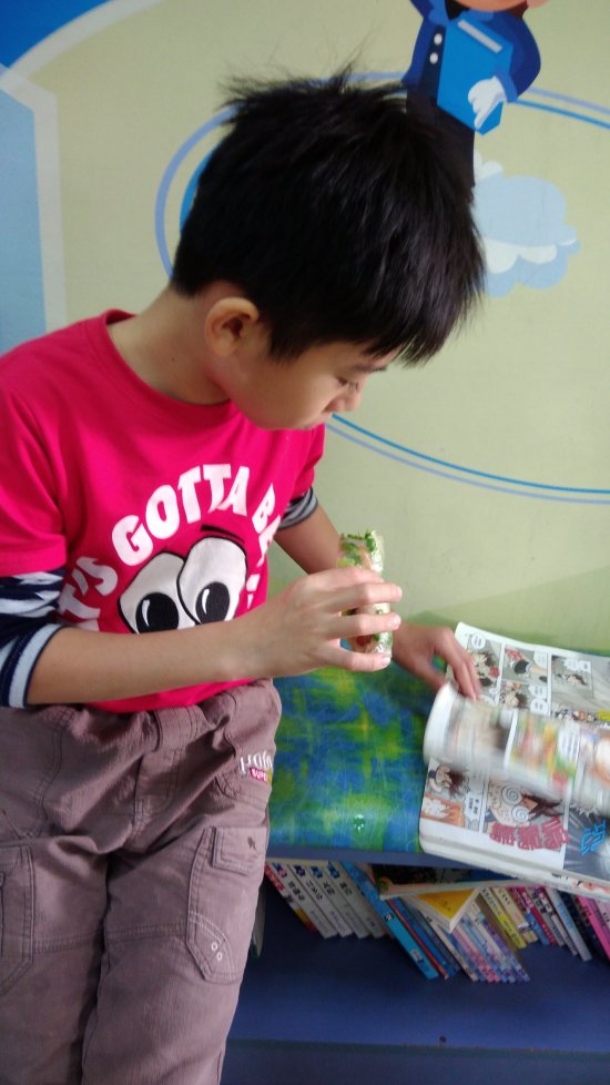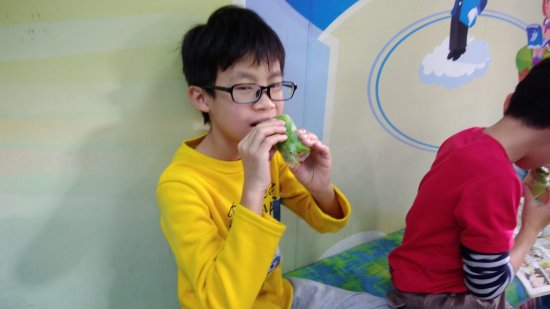 ^^發現了嗎?經過前兩次美食分享時間的提醒,現在等待的時間,大部分孩子們會自動拿起值日室的長腳書看得入迷(開動時有提醒孩子們去洗手才可以吃),許多孩子拿了春捲繼續看書配美食捨不得闔上書本呢!