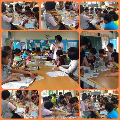 活動一:第一次上課,要來製作書的封面,第一個步驟就是挑選自己想要的紙,並且打洞。幫打完的洞黏上保護貼。挑選自己喜歡的拼布,貼在自己的封面上,還可以塗上染色的白膠,讓自己的封面更有特色。