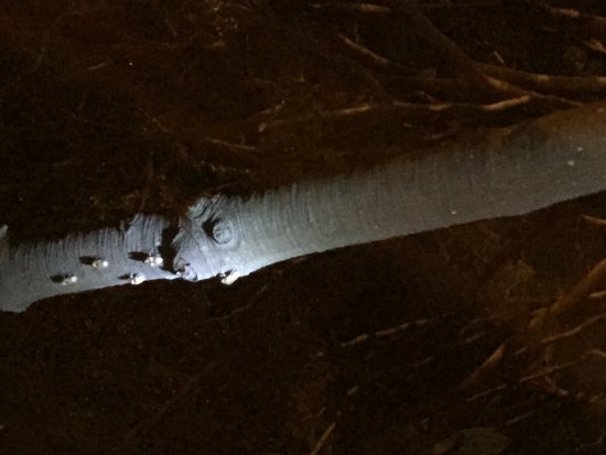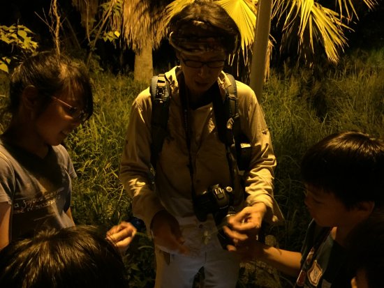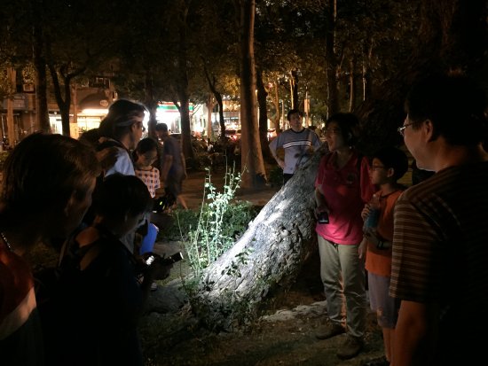 剛下完雨的五月是蟄伏在地底的蟬冒出頭的時候,正納悶著往哪兒尋找,經驗老到的野馬老師馬上發現了一隻正從地底冒出的蟬,原來在樹幹附近一個個「平坦」的洞就是出口。一個不小心,就可能會踩到這些脆弱的小生命,因此大家開始小心翼翼,邊找邊前進。不得不承認,解說員們果然是有訓練過,觀察力敏銳,「這兒一隻」、「我發現了!」、「啊!它在我的腳邊!」......,大夥紛紛有了自己的發現。我們的佇足觀察,也吸引了夜間在公園中散步的人們好奇的靠近呢!